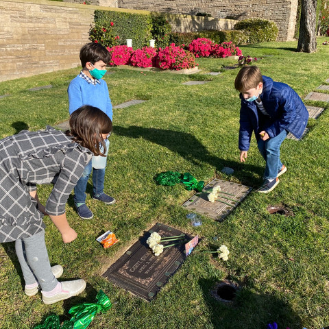 We arrived to see my mom and grandmother at our usual time, around 4 PM. We unloaded the bags out of the car, filled with spring decorations we had purchased, and gathered to festoon their graves. We brought colorful floral yard spinners that we had picked out at our favorite nursery, festive St. Patrick's Day decorations, and some fragrant stalks of freesia flowers. The kids took great care to decorate their graves which is always touching to watch. Then we took our usual "walk around the neighborhood." We always check on the new graves to see if their markers have been placed and to find out who might be "moving in" to Granny's nook of the cemetery, known as the Faith section. We also like to meander around to get decorating ideas, of which we find many. The care and creativity that families put into making the graves look special are so heartwarming. We said hello to some other families that were visiting loved ones, all clearly in their stages of grief. We ended our visit in the usual way of spreading out our blanket next to Granny and telling her about what we've been up to lately. Garin told her about the priceless heirloom bowl he broke that belonged to her (and asked her to forgive him), Since it was the one-year anniversary of the lockdown in Los Angeles the day we visited, I gave her the obligatory update on COVID. I wondered what her take on things would be, six months since her departure.