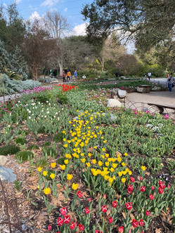After lunch, we went into the gardens, as we always do. We hadn't been there in three weeks (we had to skip the prior weekend due to unforeseen circumstances). We were mesmerized by the transformation that had taken place in those few weeks. There were glorious tulips everywhere, as far as the eye could see. There had not been even a hint of them the last time we were there, so their seemingly sudden appearance felt magical. In the blink of an eye, the entire landscape had transformed into Spring. The tulips were in all shades of pink, purple, yellow, white, orange, and red. In addition to the ravishing tulips, the cherry blossoms were in bloom and magnificent. As if all that wasn't glorious enough, as we walked around we noticed little bird nests in all shapes, colors, and sizes everywhere. The staff had made bird nests out of a variety of twigs and leaves found in the gardens and placed them in the most unexpected places. Finding them was like finding those carefully concealed candy-filled eggs on Easter Day. It was so much fun! We ended our visit with a trip back to the beloved camellia forest, which we found to be even more bloom-filled than our previous visits this winter. As we headed away, we wandered past the lilac garden to find that just a few of those had started to bloom. They were stunning and you could smell their intensely sweet fragrance a mile away. Hope was springing eternal at Descanso Gardens.