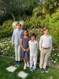 Illia, my "fifth child," for the day, joined us. Illia, with eight of his family members, fled Ukraine three days after the war started. He and his family eventually ended up in the United States, first fleeing to Romania, then to Hungary, then to the Czech Republic, then to Mexico City, then to Tia Juana, and finally over the border to the United States. They are currently staying in Hidden Hills in a home that was temporarily provided to them. Illia, is 14 like Garin, and they are now classmates at AE Wright Middle School. They have forged a sweet friendship that means a lot to both of them. They meet up and ride bikes, go swimming, and do other fun things in the neighborhood. (Note Miles holding President Reagan's hand in this photo).