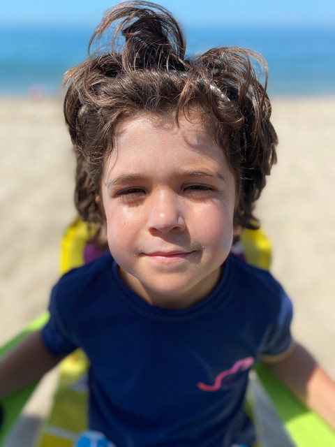 Boys who need a haircut borrow their sister's headband while having sunscreen applied! It's a look!